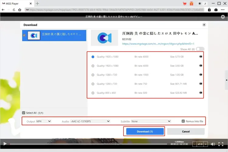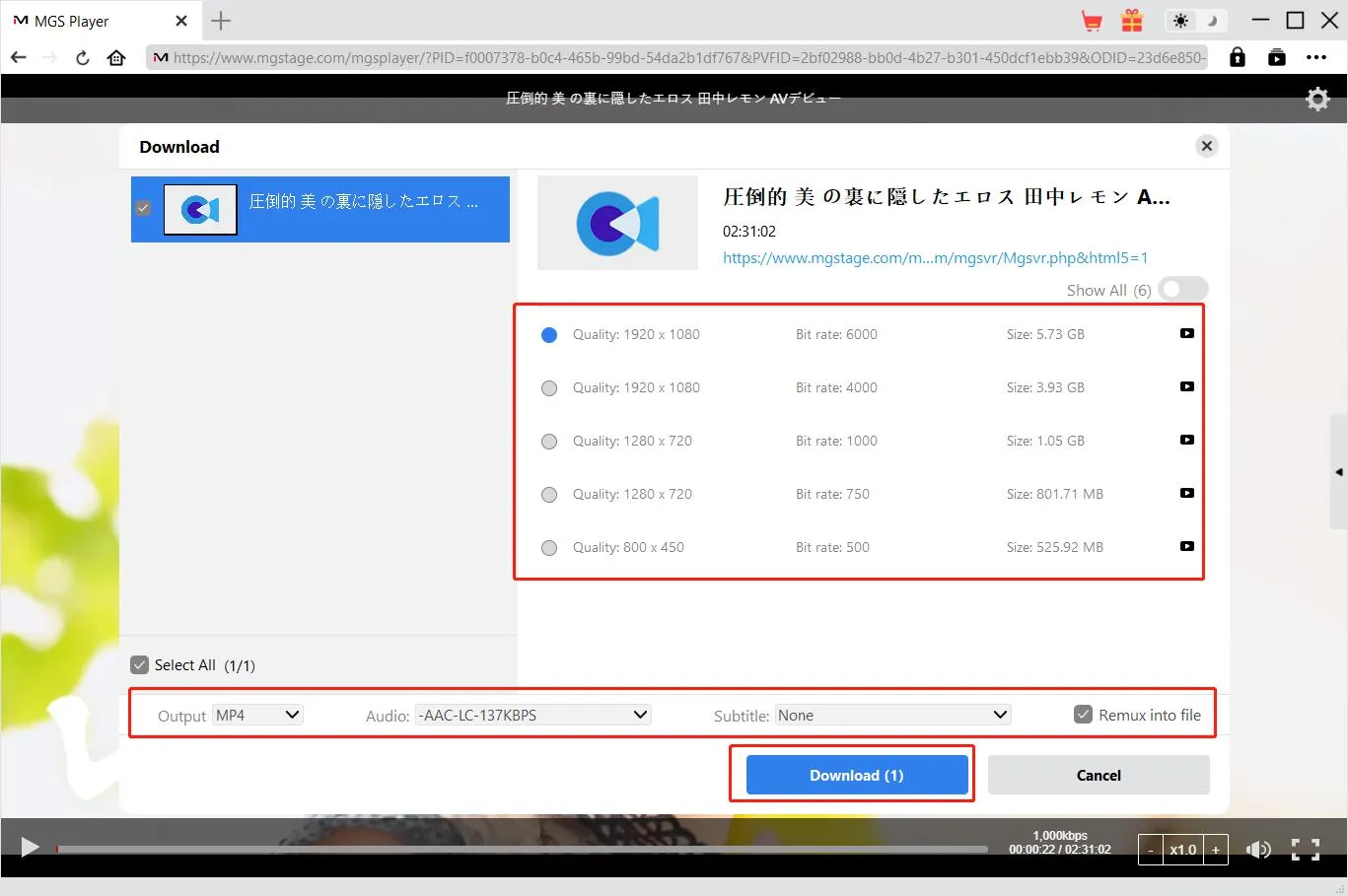 Click the download icon at the bottom of CleverGet on the MGStage video playback page to let CleverGet MGS Downloader parse the video URL. After successful parsing, CleverGet will pop up a "Download" window with all available download options. Choose the one you want to download, decide the output format, subtitle and audio track (if available), and then click the blue "Download" button to start downloading MGStage videos.