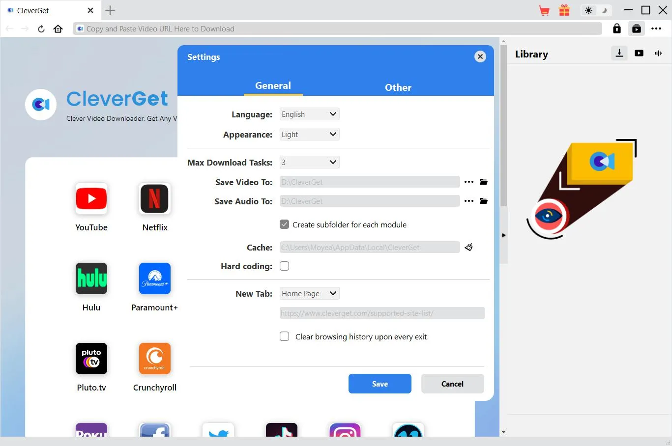 On CleverGet program, click the three-dot icon at the top-right corner and then click "Settings" option to open "Settings" panel. On the "General" tab, you can set output directory in the "Save Video To" box, change other settings like program UI language, appearance, max download tasks, etc. Finally, click the blue "Save" button to save all settings and quit the settings panel.