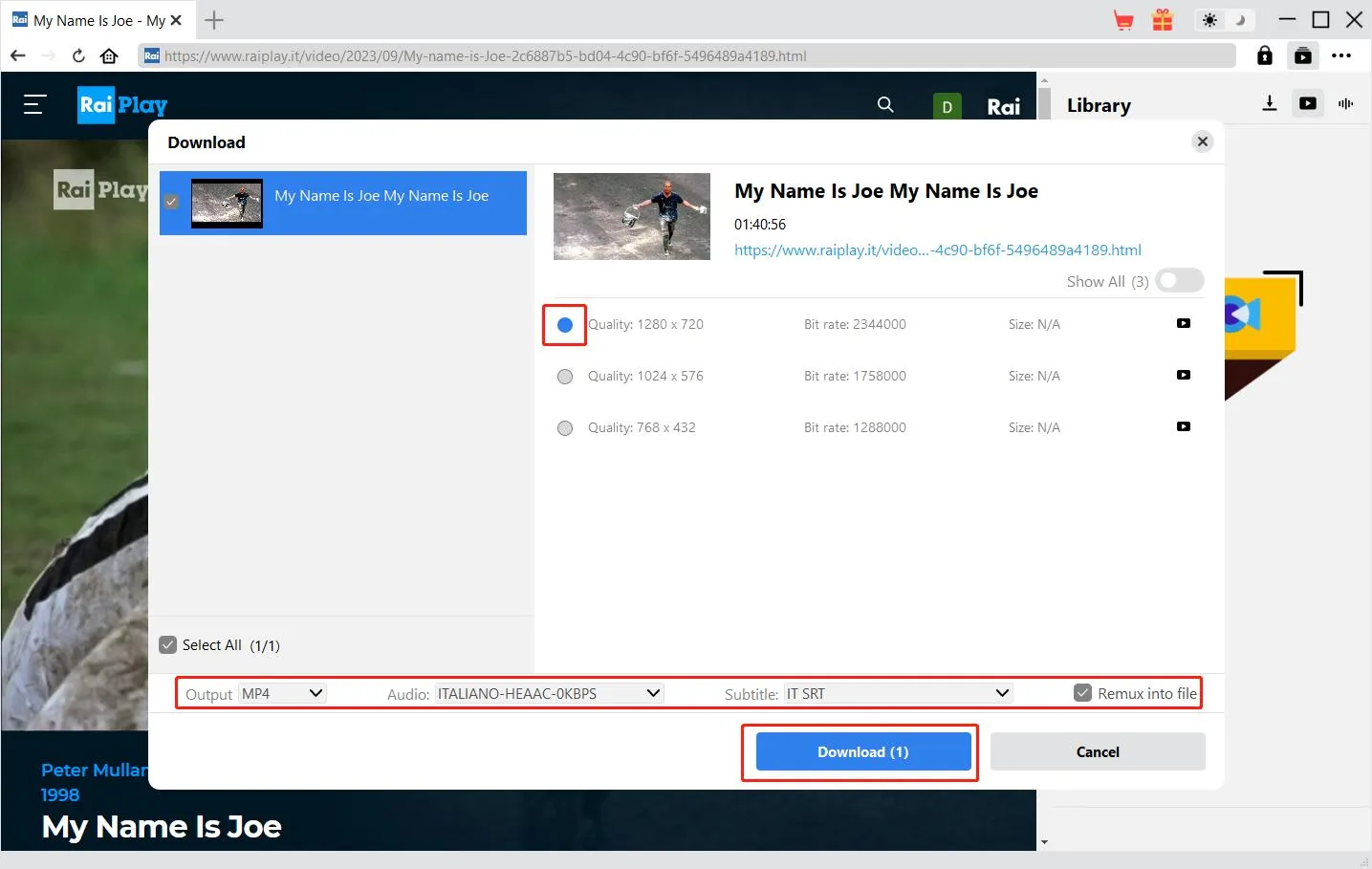 To let CleverGet parse the target video, you need to click the download icon at the bottom right corner of the RaiPlay video playback page. After successful parsing, CleverGet will pop up a "Download" window with all available download options. Choose the one you want to download, decide the output format, select audio tracks and subtitles, and choose to pack subtitles into output file or not, then click the blue "Download" button to start downloading RaiPlay videos.