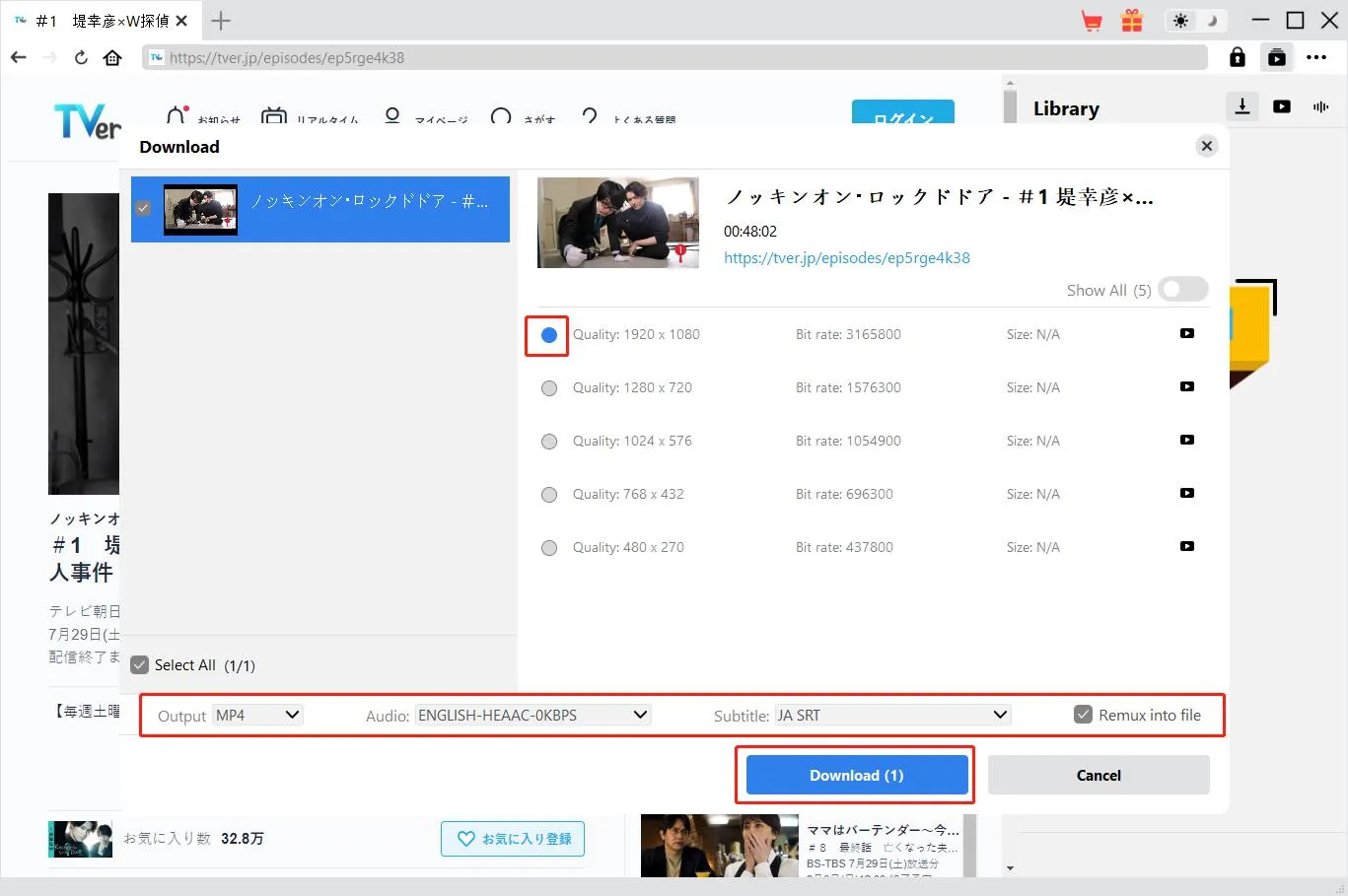 Click the download icon at the bottom of CleverGet on the TVer video playback page to let CleverGet TVer Downloader parse the video URL. After successful parsing, CleverGet will pop up a "Download" window with all available download options. Choose the one you want to download, decide the output format, subtitle and audio track (if available), and then click the blue "Download" button to start downloading TVer videos.