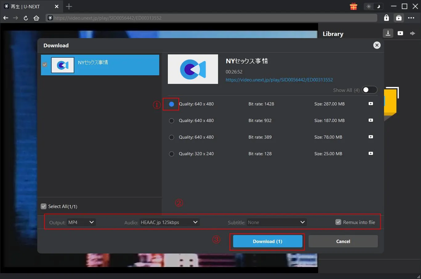 When you enter the video playback page, you could see the icon at the bottom right corner, by clicking which CleverGet U-NEXT Downloader will immediately parse the target video URL. If CleverGet U-NEXT Downloader successfully parses the video, it will pop up a "Download" interface with all available download options in different quality/resolution, frame rates and sizes. Choose the one you want to download. Also, set Output format from MP4 and MKV, select Audio Tracks and Subtitles below. And then click "Download" button to start downloading U-NEXT movie.