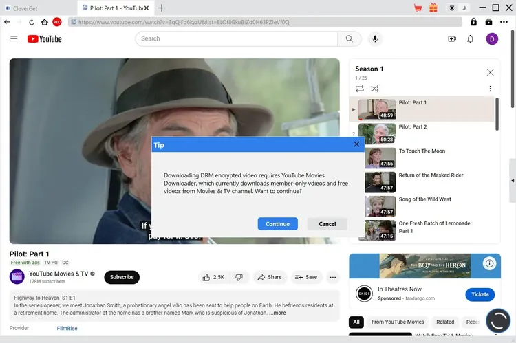 Once you are playing back the target video, CleverGet YouTube Movies Downloader will parse the in-playing page. There will pop up a notice dialog showing you YouTube Movies Downloader is required for handling DRM protected or members-only videos. Click "Continue" button here.