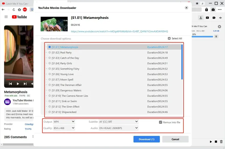 Choose the download options, set either MKV or MP4 as output format, select audio tracks and subtitles, and decide whether or not to pack subtitles into output video file by checking "Remux into file" option. Afterwards, click "Download" button to start downloading shows, movies, or members-only videos.