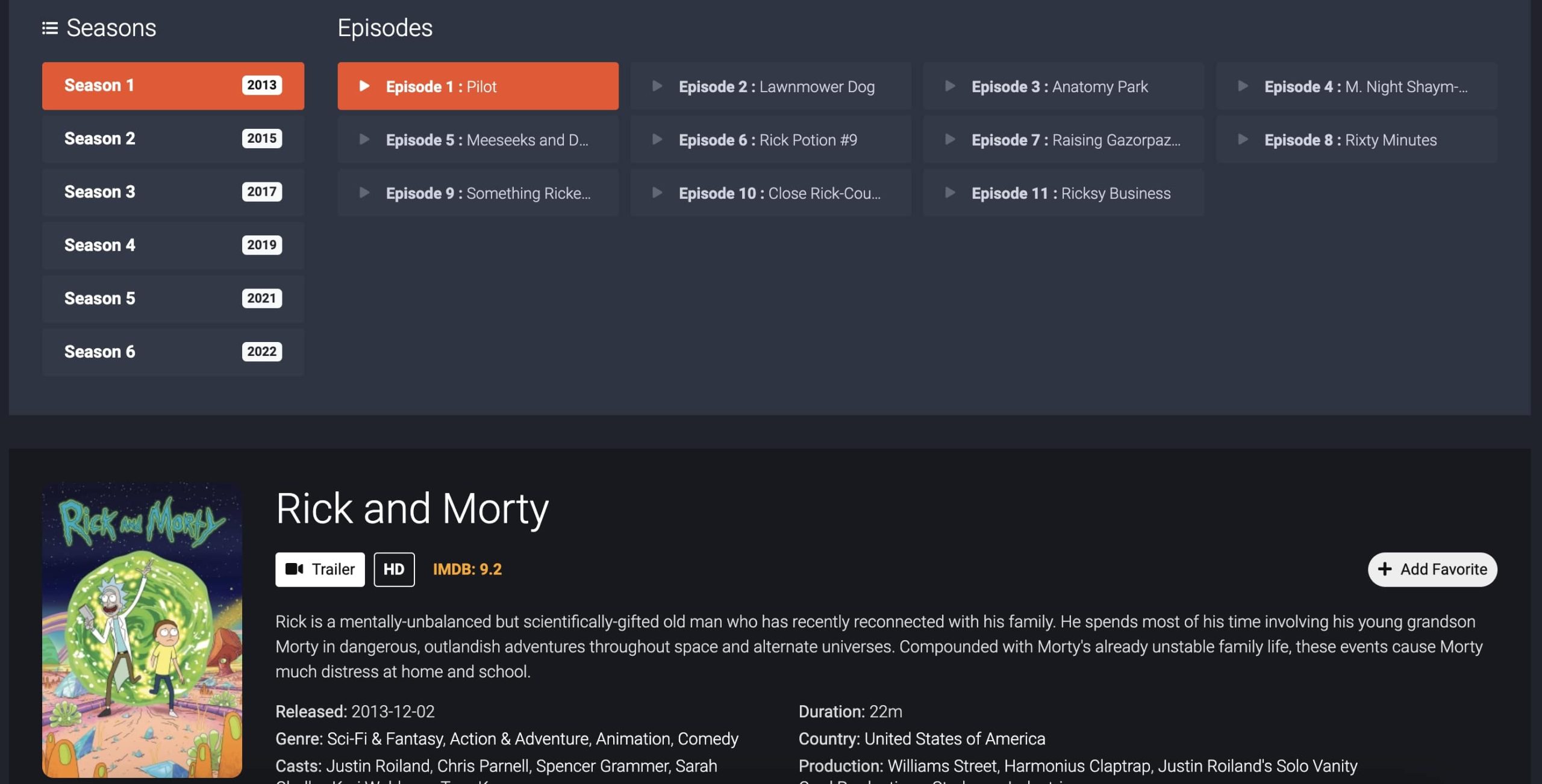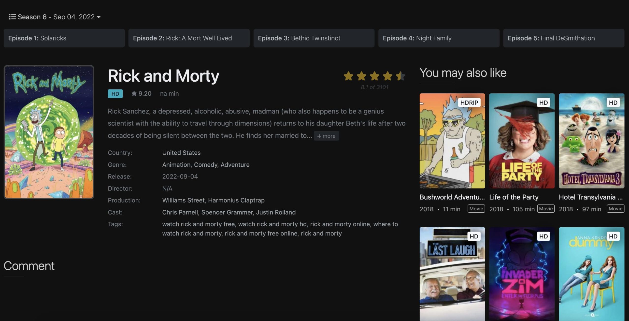 Where else can you watch Rick and Morty free? Try XMovies8. The free streaming site offers Rick and Morty seasons 1 through season 6, with the latest update on episode 5 of season 6. One great advantage is that all content on XMovies8 can be streamed in HD quality. Designed with a simple interface, XMovies8 is straightforward to use.