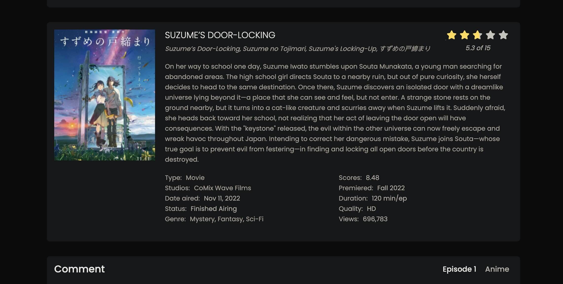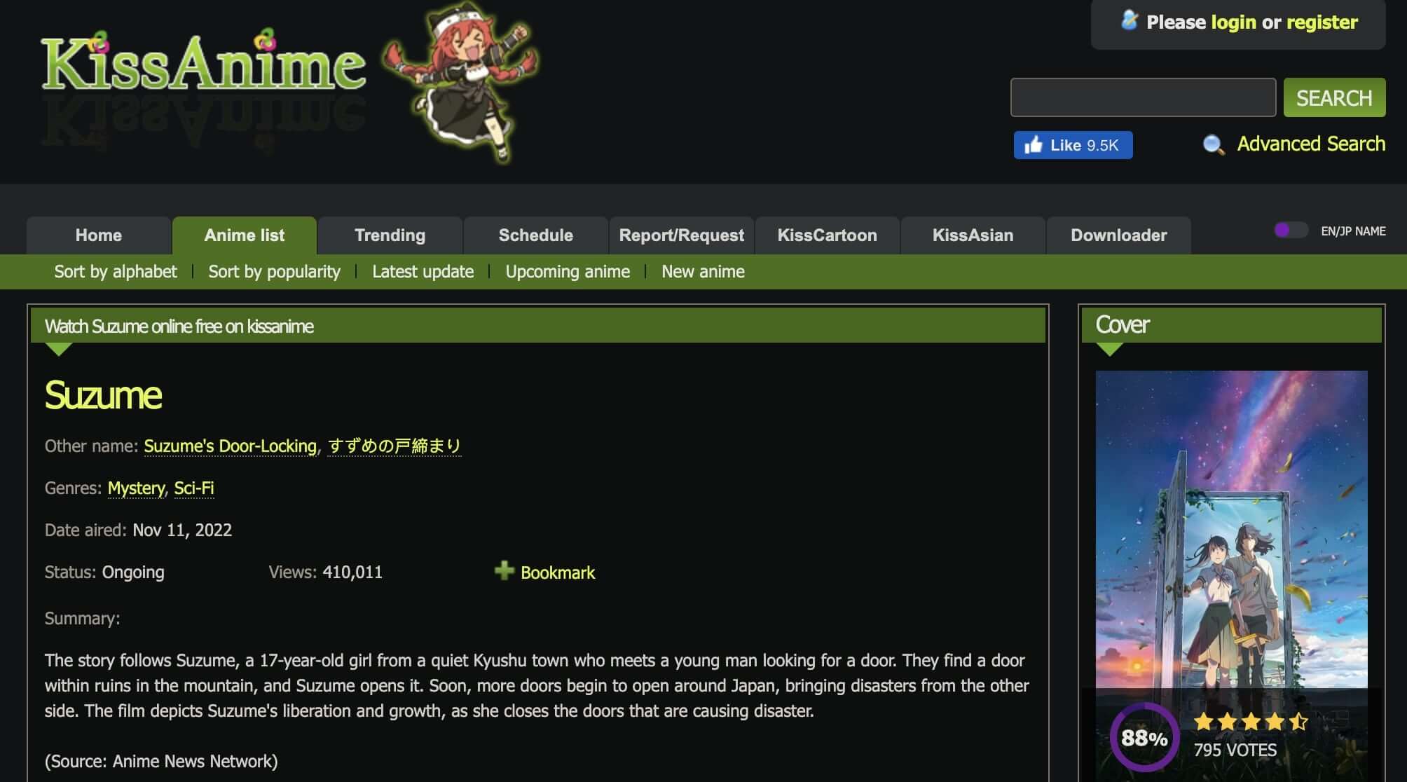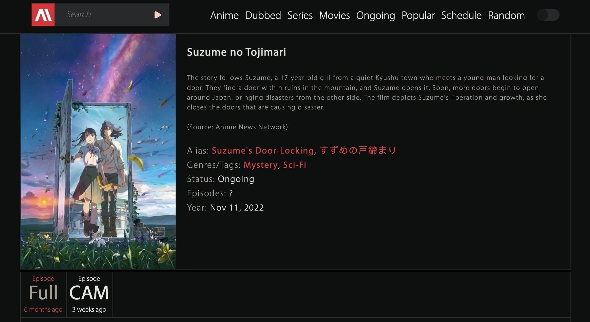 As one of the best alternatives to 9anime, KissAnime is the place to stream Suzume No Tojimari for free. The site currently has a cam version of Suzume No Tojimari for streaming, but the quality is not that bad. You can also try 9anime for better video quality. With 3 streaming servers and very few ads, KissAnime can be a solid choice to watch Suzume No Tojimari without interruption.