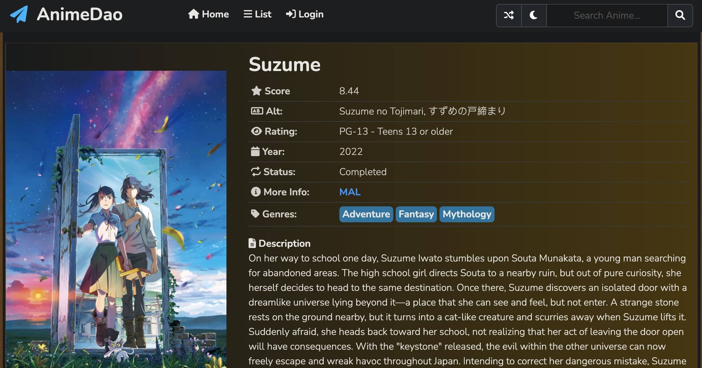 AnimeDao is also the best free site for Suzume No Tojimari streaming. You can watch Suzume No Tojimari with up to 1080p video quality and there are 2 servers for streaming. The loading speed is pretty good without buffering. Since AnimeDao is completely free to use, the pop-up ads are showing on the site but they are not that rampant. You can also use an ad-blocker to stop ads from showing.