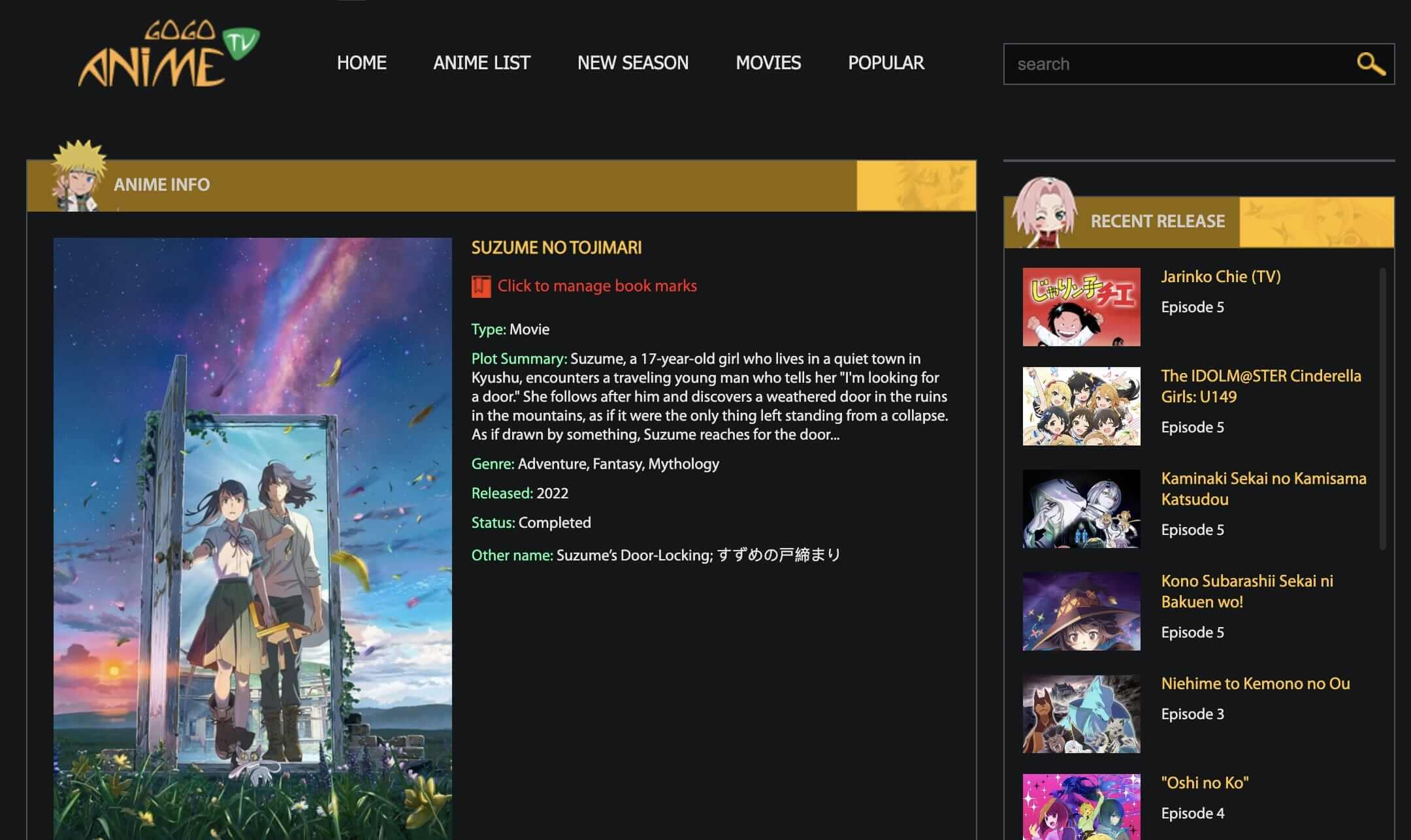 The free anime streaming site, Gogoanime is another great choice to watch Suzume No Tojimari full movie online for free. You can stream the movie with up to 1080p video quality here and there are 4 streaming servers for you to choose from. For those who want to download Suzume No Tojimari full movie for offline playback, Gogoanime has also got you covered.