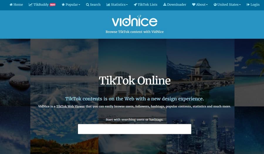As another online TikTok viewer, Vidnice is an amazing site allowing you to browse users, followers, hashtags, popular contents, statistics and much more. It also highlights popular TikTok accounts on the homepage, by which you can easily watch all TikTok videos of these accounts without app. You can also navigate to popular videos, popular hashtags, and TikTok lists to find your favorite TikTok videos for viewing. It also enables you to directly search for your preferred users or hashtags.