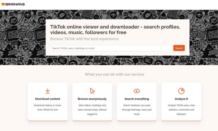 Brainans is an anonymous TikTok viewer website that makes it easy for you to watch and download your favorite TikTok videos anonymously without you logging into your account. The homepage lists trending profiles, top tags and popular videos to help you find your preferred TikTok accounts and TikTok videos in general. If you’re looking for TikTok videos from a certain account or a hashtag, you can just type in the username or the video URL into the search bar to browse TikTok for free.