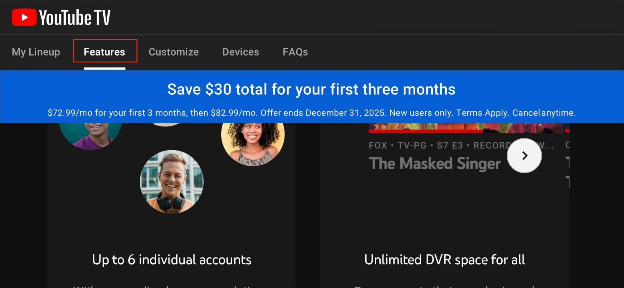 With YouTube TV DVR, you can record an unlimited number of programs simultaneously, including live broadcasts, sports events and other content. Moreover, there is no limit to the number of saved recordings, and these stored recordings do not occupy the storage space on your mobile device, tablet, personal computer or smart.