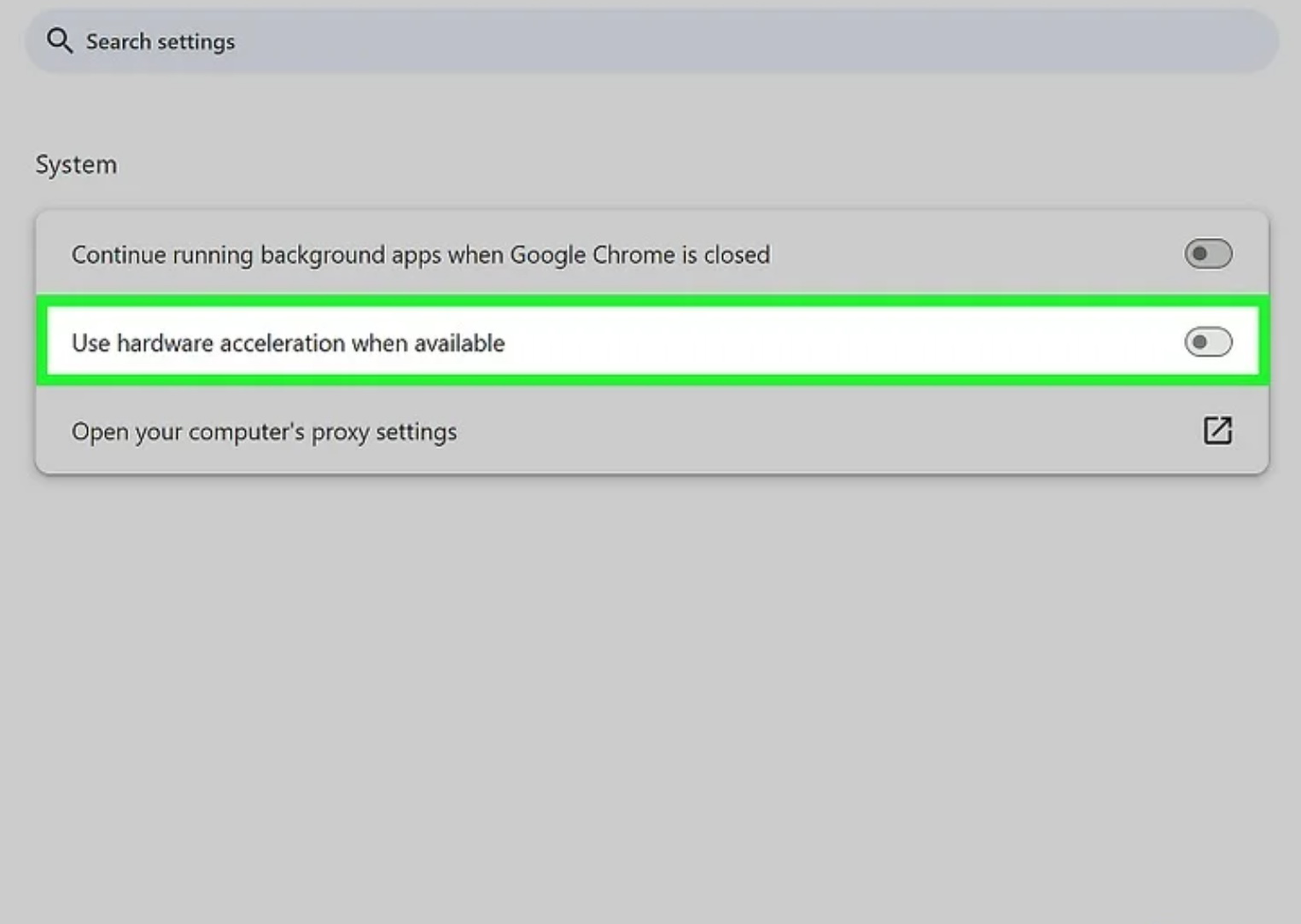 3) Locate the “Use hardware acceleration when available” option and disable it.