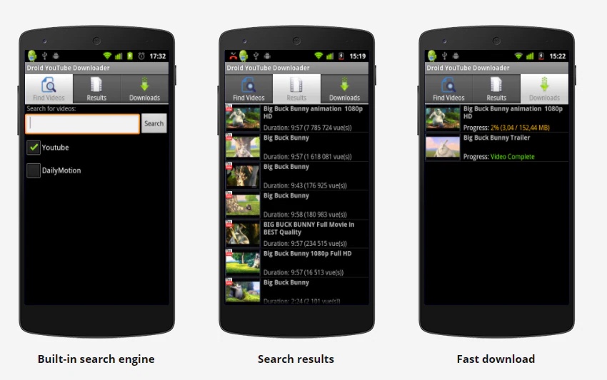 Droid YouTube Downloader is an easy-to-use YouTube music downloader app for Android. With Droid YouTube downloader, you can download videos and music on YouTube and Dailymotion. With a built-in search engine and player, the app allows you to locate the content you want to download easily. The simple and rich graphic interface also provides a better user experience.