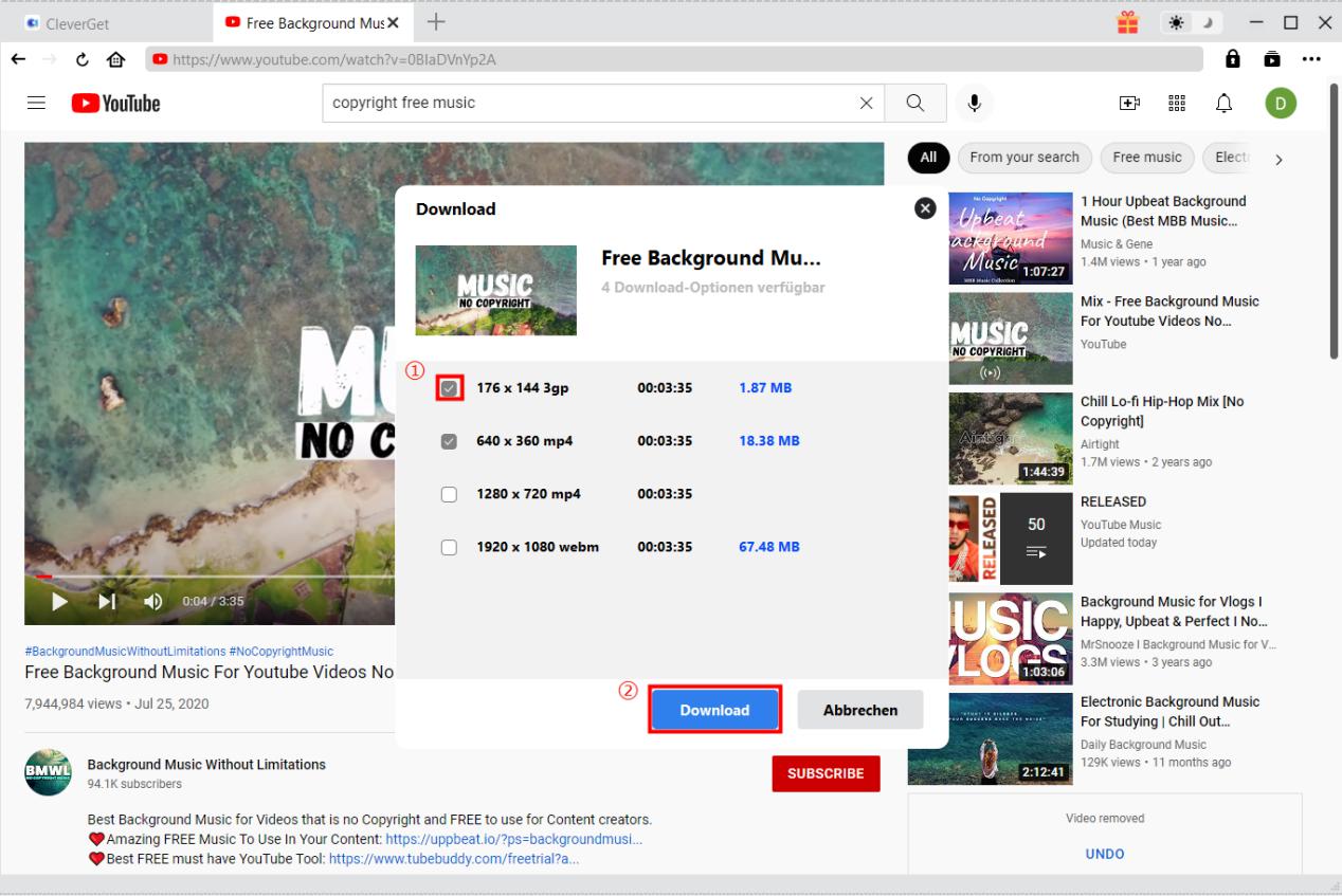 Sobald Sie einen Videolink öffnen, erkennt CleverGet die verfügbaren Quellen für den Download. Die Videos werden in verschiedenen Formaten, Größen und Auflösungen aufgelistet. Wählen Sie die gewünschte(n) Video-Download-Option(en) und klicken Sie dann auf "Herunterladen".