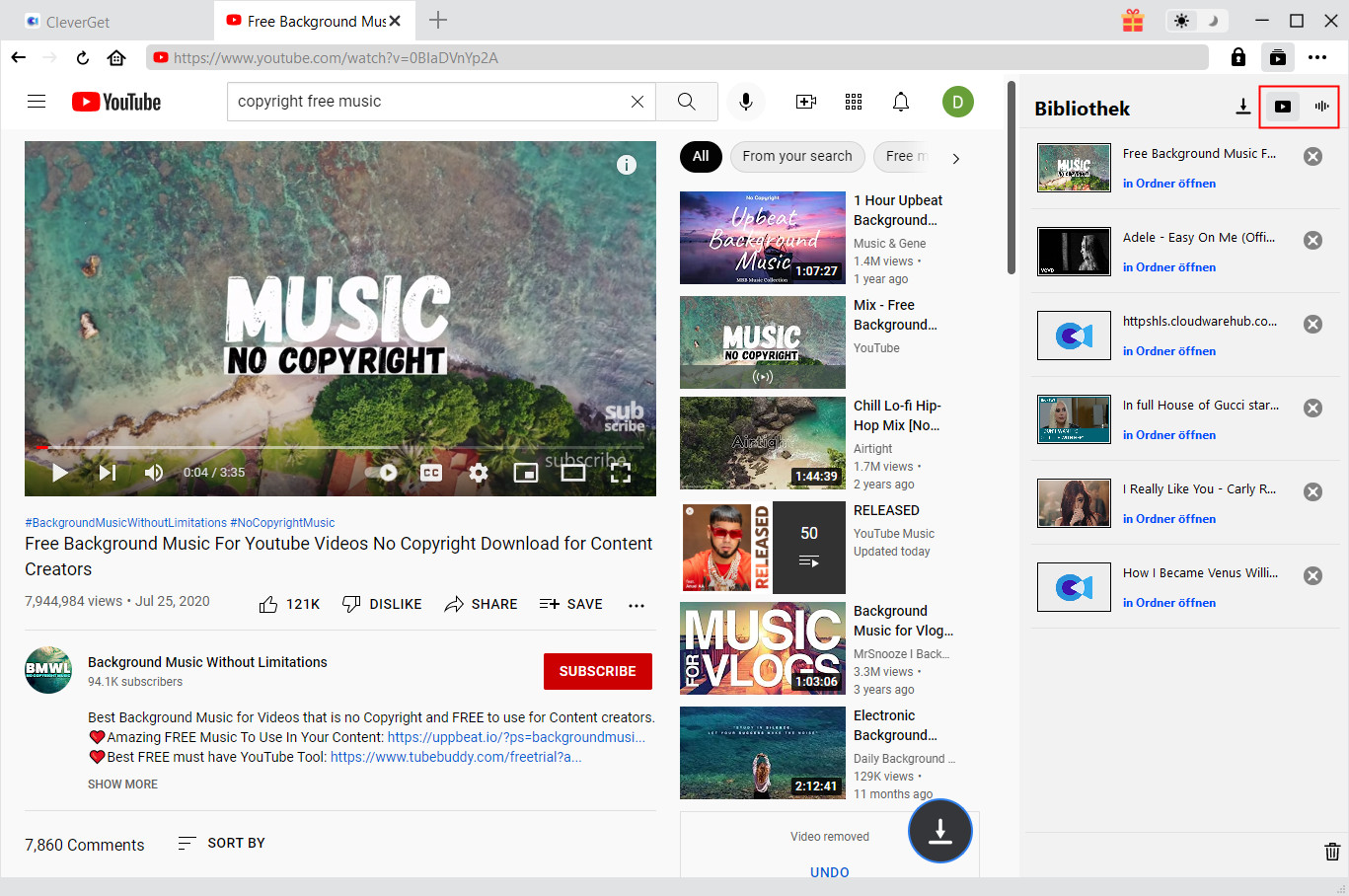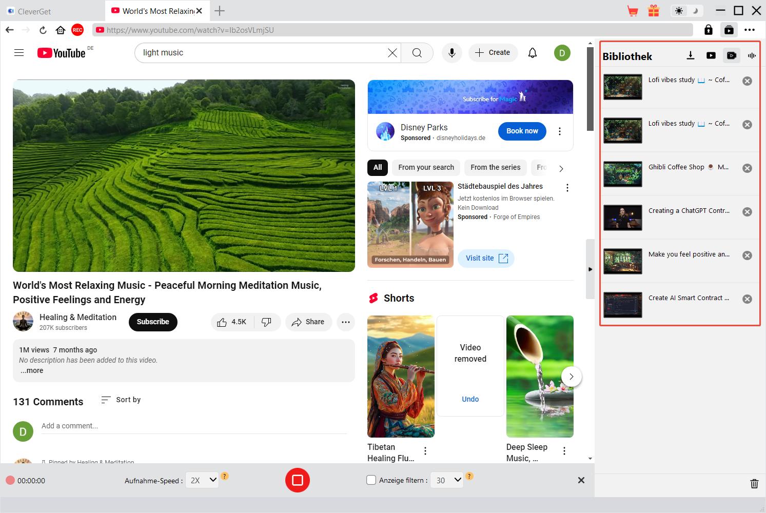 Sie können die Aufnahme jederzeit anhalten und wieder fortsetzen. CleverGet Streaming Video Recorder erstellt jedes Mal eine Aufzeichnungsdatei, wenn Sie die Aufzeichnung stoppen. Sie können die Aufzeichnungen in der rechten Sidebar ansehen, die durch Klicken auf das Symbol „Bibliothek“