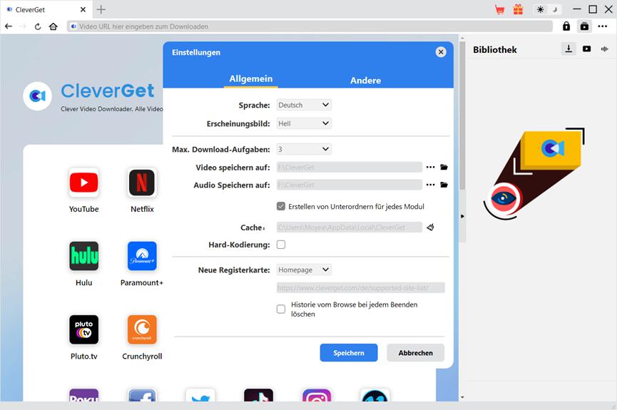 Starten von CleverGet und zunächst das Download-Verzeichnis festlegen. Mit einem Klick auf das Drei-Punkte-Symbol oben rechts öffnen Sie die Option "Einstellungen", um ein detailliertes Einstellungsfenster aufzurufen. Auf der Registerkarte "Allgemein" können Sie das Ausgabeverzeichnis im Feld "Video speichern auf" oder "Audio speichern auf" festlegen und andere Einstellungen ändern. Wenn Sie die Option "Unterordner für jeden Streaming-Service erstellen" aktivieren, werden die Online-Videos je nach Video-Website in den entsprechenden Unterordnern gespeichert. Klicken Sie schließlich auf die Schaltfläche "Speichern".