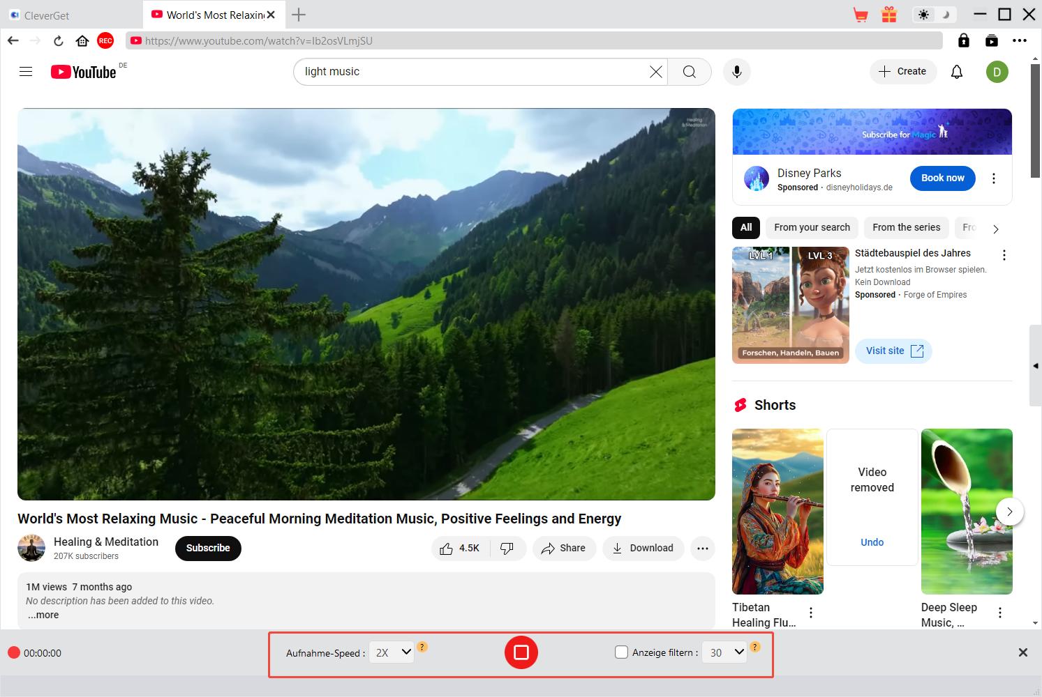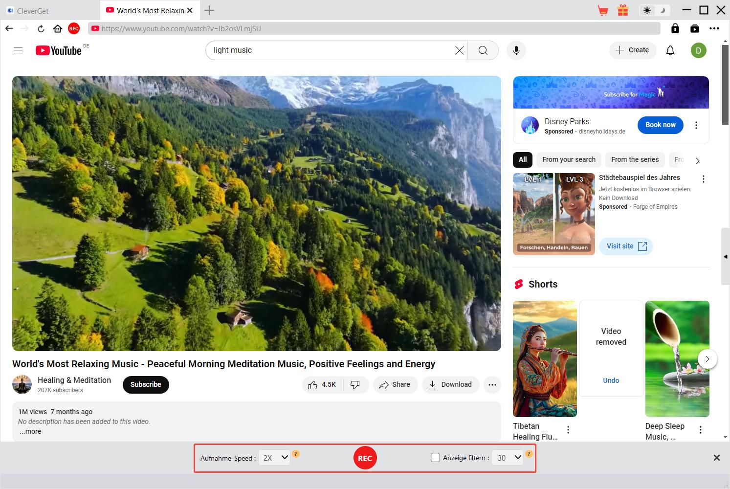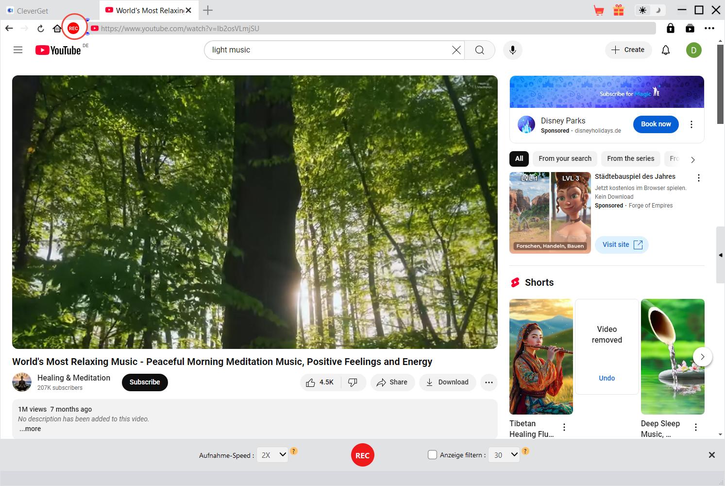 Wenn Sie alle Einstellungen vorgenommen haben, klicken Sie auf die rote Schaltfläche „REC" in der Symbolleiste „Aufnahme", um die Aufnahme des Online-Videos zu starten. Während der Aufnahme können Sie die Optionen „Aufnahmegeschwindigkeit“ und „Werbefilter“ ändern.